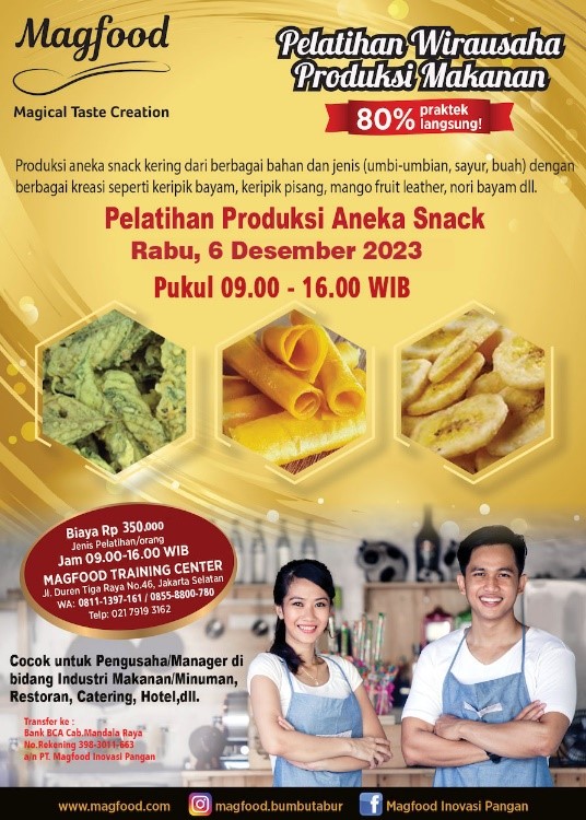 Untuk lebih memahami proses produksi dan strategi pemasaran dalam bisnis keripik buah dan sayur, Anda dapat mengikuti pelatihan “Produksi Aneka Snack” yang akan diselenggarakan pada tanggal 6 Desember 2023. Pelatihan ini akan memberikan wawasan mendalam tentang proses produksi, strategi pemasaran, dan tren terkini dalam industri makanan ringan.