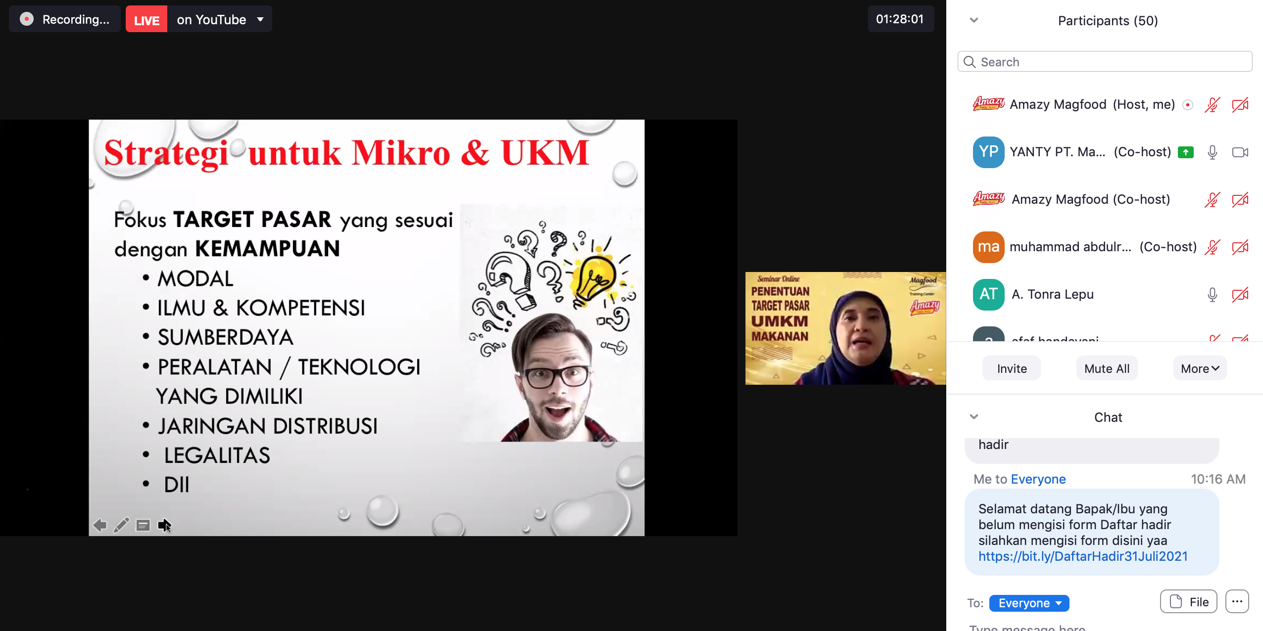 Saturday (July 31, 2021) Magfood Training Center held a FREE Webinar with the theme “Determination of the Food MSME Market Target. The activity was held at 10.00 -12.15 WIB, using the Zoom Cloud Meetings application. Presenting resource persons who were very experienced and experts in the field of Development & Productivity of Food Products, namely Mrs. Yanty Melianty Isa, as CEO and Founder of PT. Magfood Innovation Pangan.