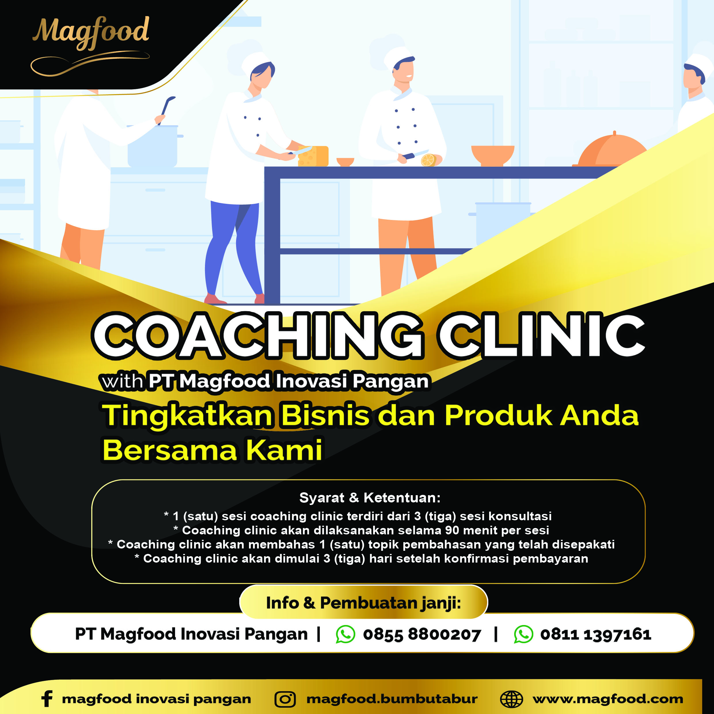 - 1 sesi Coaching Clinic terdiri dari 1 sesi konsultasi dengan ahli dari Magfood (bisa dihadiri sendiri atau bersama tim, online maupun offline)