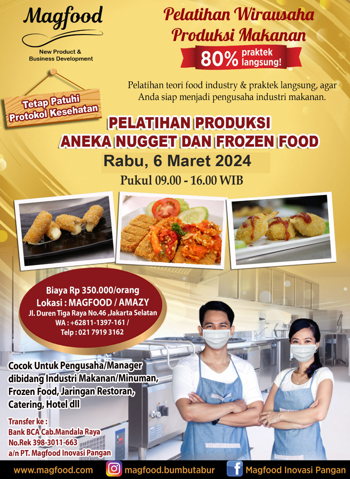Seminar online yang diadakan Magfood Training Center memiliki beberapa tema yang sangat diperlukan bagi pelaku bisnis di bidang makanan atau kuliner untuk menjalankan atau mengembangkan usaha yang dijalaninya. Sedangkan Pelatihan Wirausaha Produksi Aneka Makanan memiliki beberapa tema yang diadakan seperti Pelatihan Produksi Nugget dan Aneka Frozen Food, Pelatihan Produksi Aneka Olahan Bakso, Pelatihan Produksi Snack, dan Pelatihan Produksi Ice Cream dan lain sebagainya. Pelatihan yang diadakan ini berisi pengetahuan tentang produk, ilmu dasar, bahan baku produk, alat dan cara pembuatan, strategi pemasaran, perhitungan biaya produksi dan pengembangan usaha ke depan, yang dilengkapi dengan praktik produksi dan penyusunan Standart Operating Procedure (SOP).